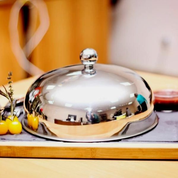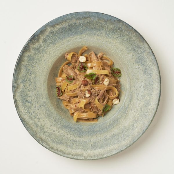 Говяжий язык на углях с лесными грибами и угольными сливками