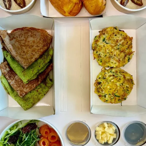 Сет блинов из шпината и голубики с слабосоленым лососем